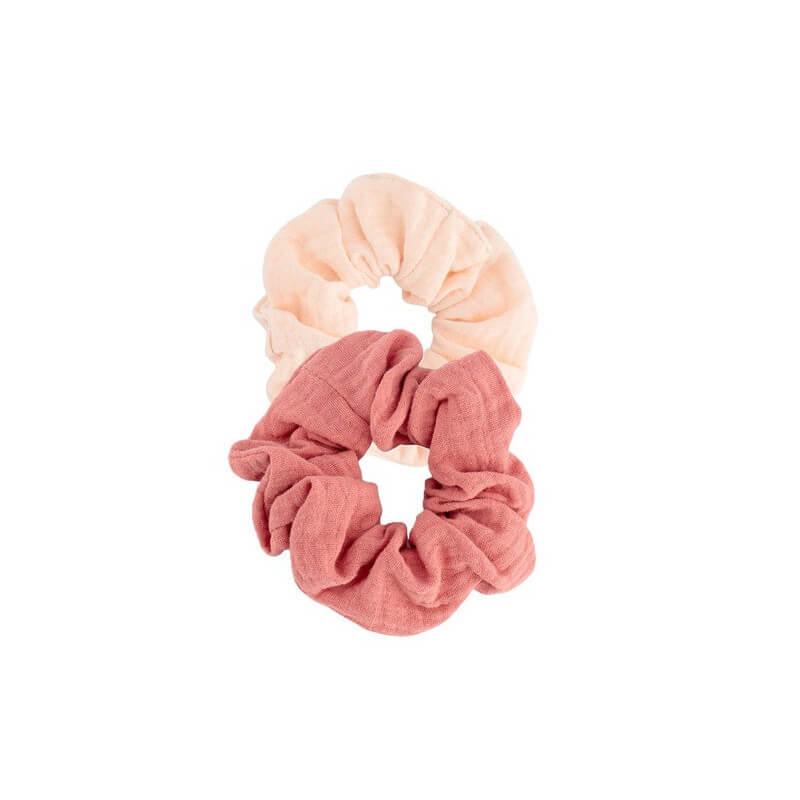 Deux chouchous couleurs écru et terracotta en gaze de coton.