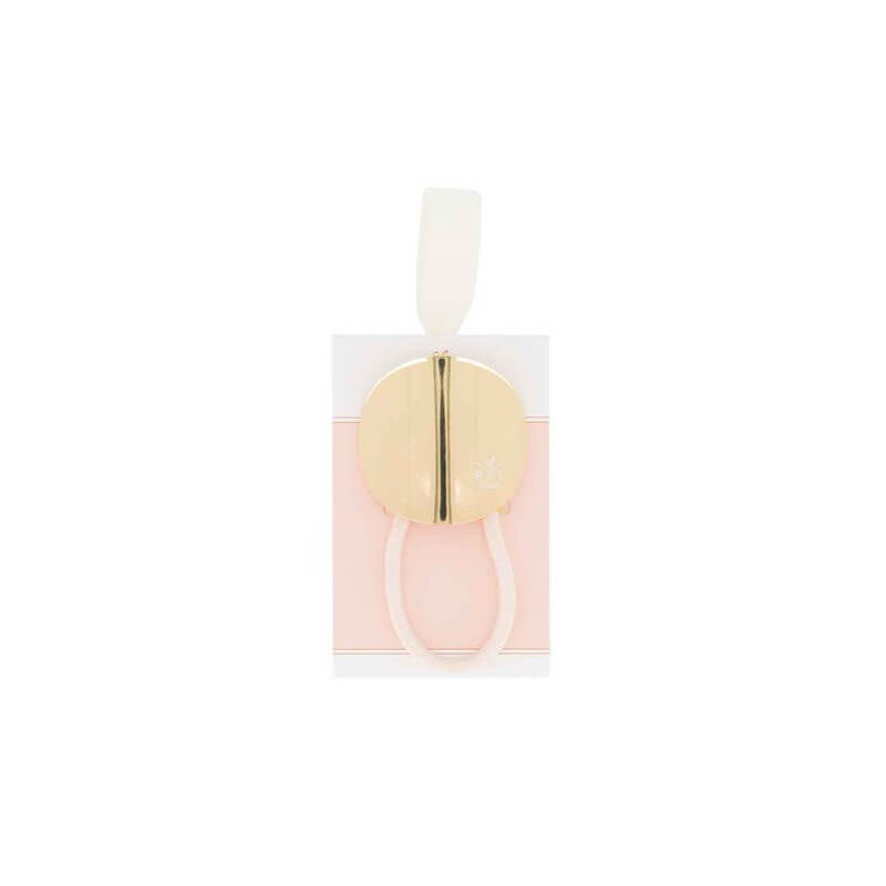 Idéal en queue de cheval ou en demi-queue, cet élastique beige orné d'une plaque en métal doré se porte en toutes occasions.