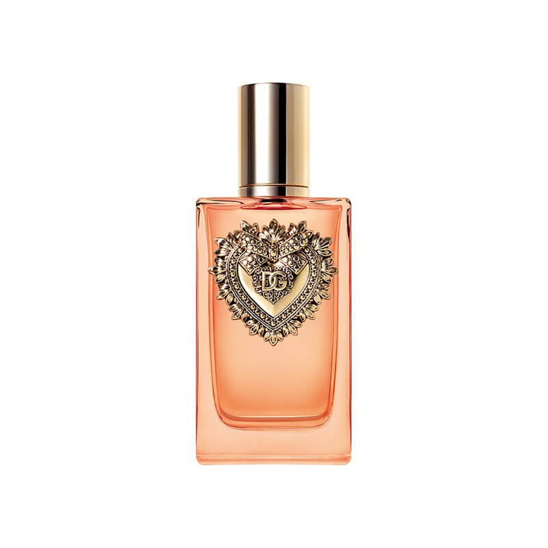 Dolce&Gabbana Devotion Eau de Parfum Intense est présenté dans un flacon en verre d’une éclatante teinte ambrée, orné avec goût du sceau du Sacré Cœur, symbole universel