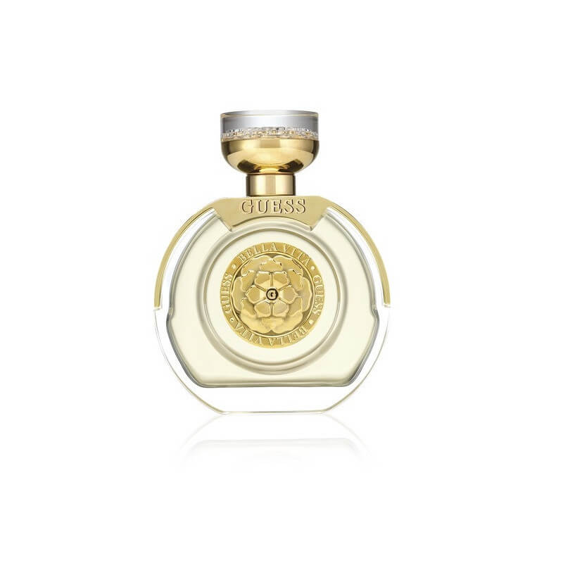 Le design de Bella Vita s'inspire de l'héritage mode intemporel de la marque. Le flacon et son étui portent l'emblématique médaillon de pivoine GUESS au centre. Le verre transparent révèle la couleur chaude et riche du parfum, tandis que l'opulente coiffe en or ajoute un détail précieux.